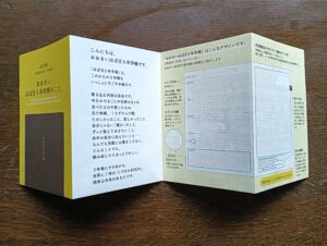 箱を開けたときに一番最初に見えた、黄色いパンフレットと、ぺらっとした用紙も見ていきましょう。
