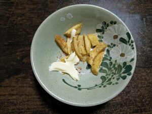 マヨネーズです。邪道ですが、ポテト、七味との相性は抜群。
