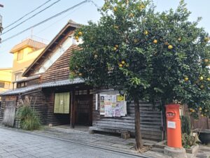 京都らしい木造の平屋に、朱色のレトロなポスト。そして、鮮やかな黄色い実がたわわに実った柑橘の木。