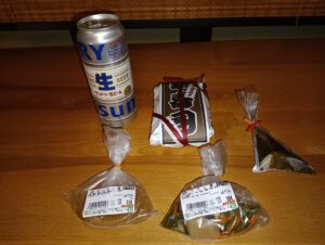 宿近くのお惣菜屋さん「いづ元」で買ったぜいたく煮とわらび煮、錦市場の「麸嘉 錦店 Fuka」で買った麩饅頭、そしてビールと一緒にいただいて、The京都な感じのお夕飯です。