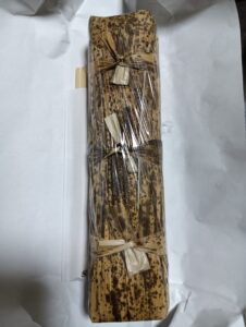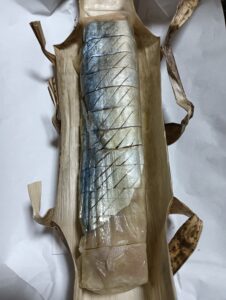 はるばる京都から持って帰って来た鯖寿司がこちら。渋めの赤い紐がオシャレですね。