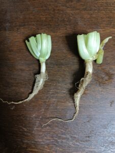 ですが、今回はリボベジするため、こんな感じであえて根っこに近い部分を長めにして切り落としました。